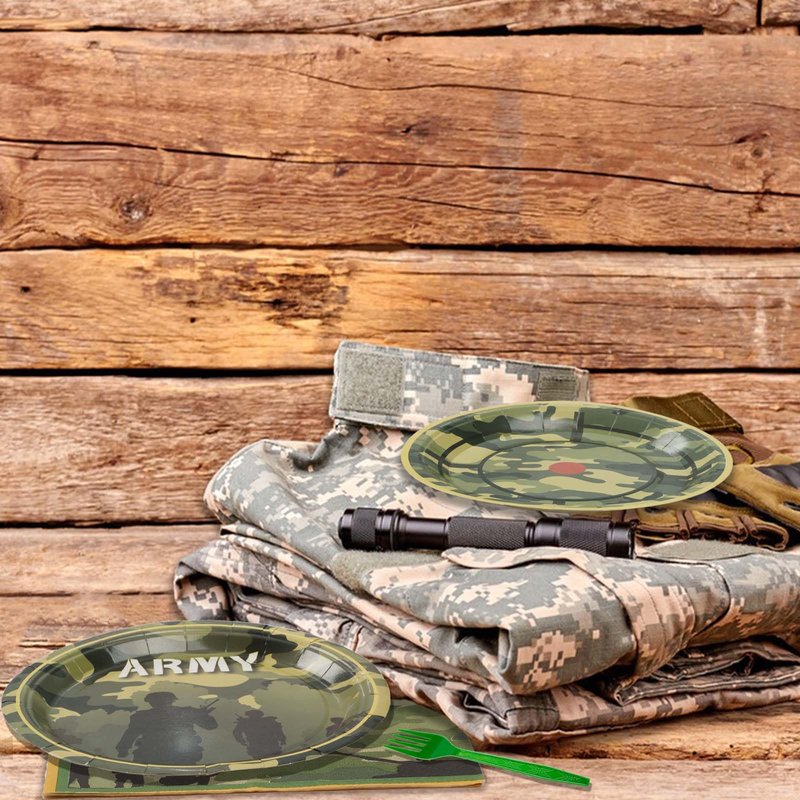 The army party supplies kit contains everything you need for easy setup and takedown. This army party supplies pack includes disposable 24 9" dinner plates, 24 7" dessert plates, 24 napkins and 24 forks.