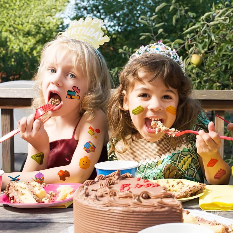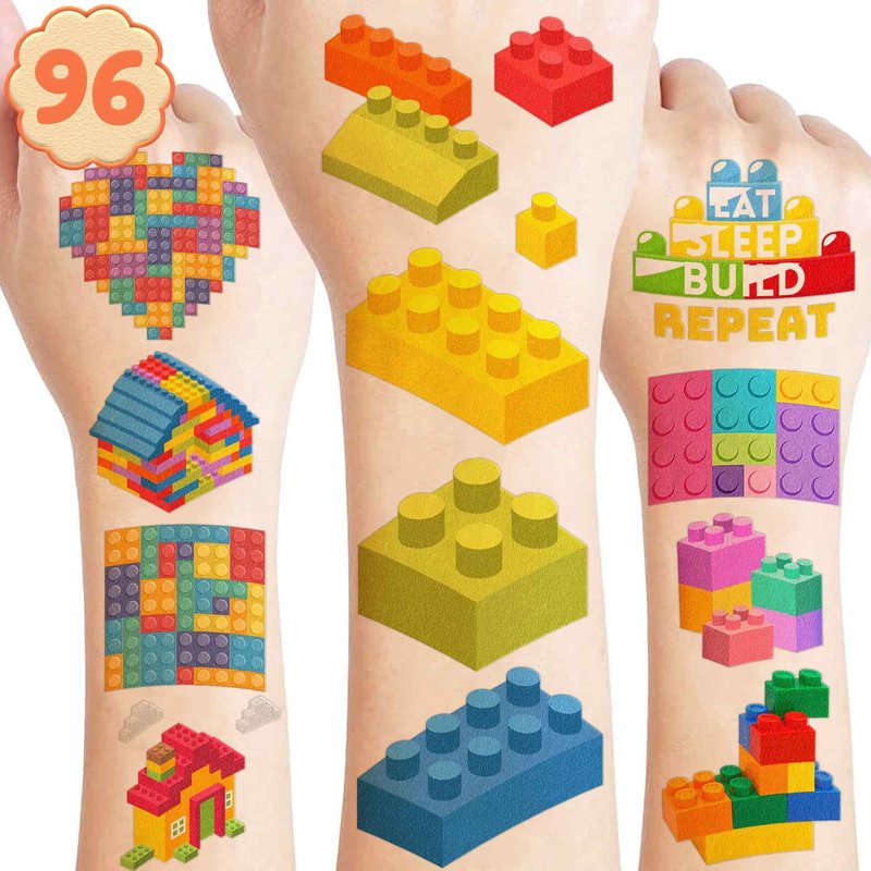 - 🎉【PERFECT TATTOOS FOR THEMED BUILDING BLOCK DECORATIONS】: Building Block temporary tattoo stickers include 8 sheets in total. There are 96Pcs super cute tattoo differences. Perfect for giving out party favors and holiday theme small gifts. The size of each sheet is 6.1 * 3.1 inches. One size fits kids