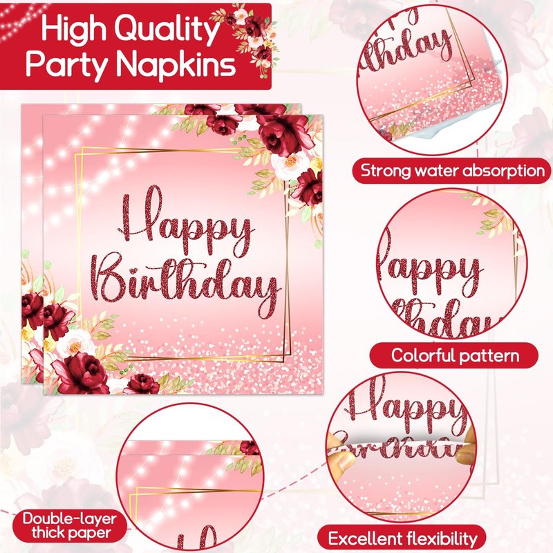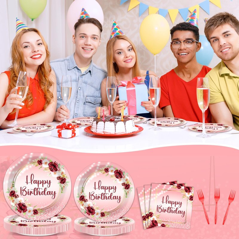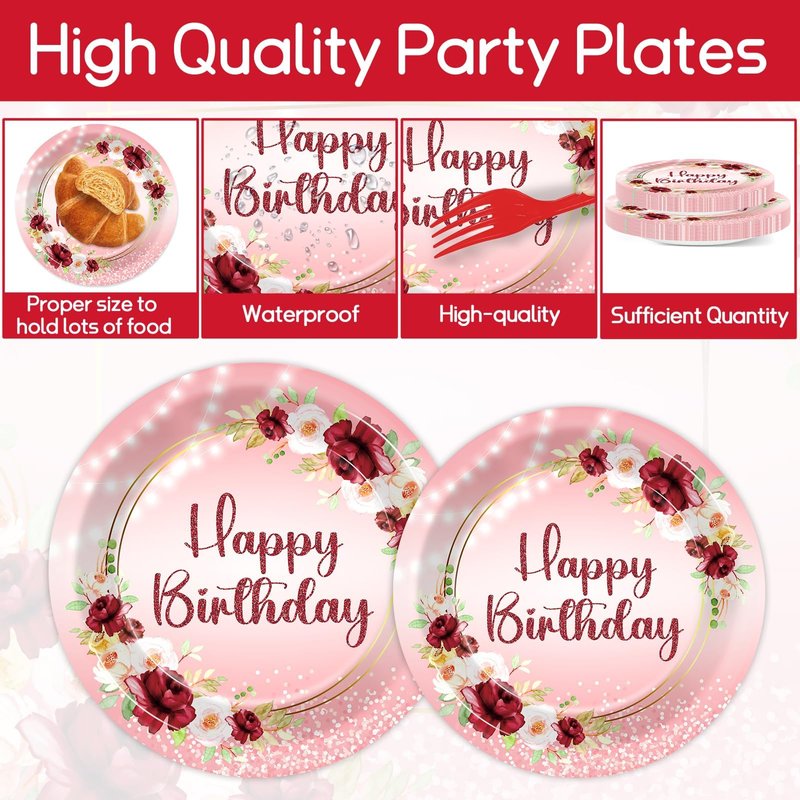 - Burgundy flower design: The burgundy floral design of this happy birthday plate set combines the elegant burgundy color with attractive flowers to create a very appealing visual experience. This versatile women birthday party supplies are ideal for adding a romantic atmosphere to birthdays.