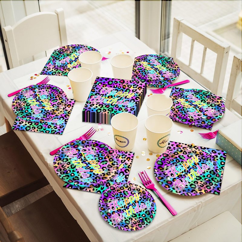 - Package includes: You'll get 24 pieces of rainbow leopard print pattern birthday party paper dinner plates of 9in, 24 pieces cheetah print birthday party dessert plates of 7in, 24 pieces of neon rainbow party napkins 6.5in, and 24 pieces of plastic green forks for each set that can serve 24 guests.