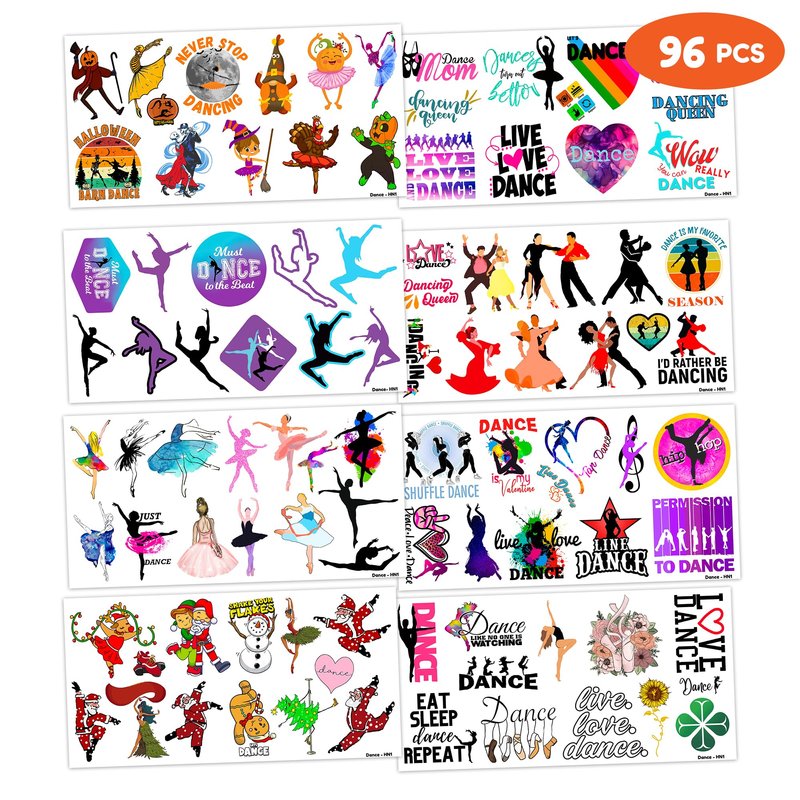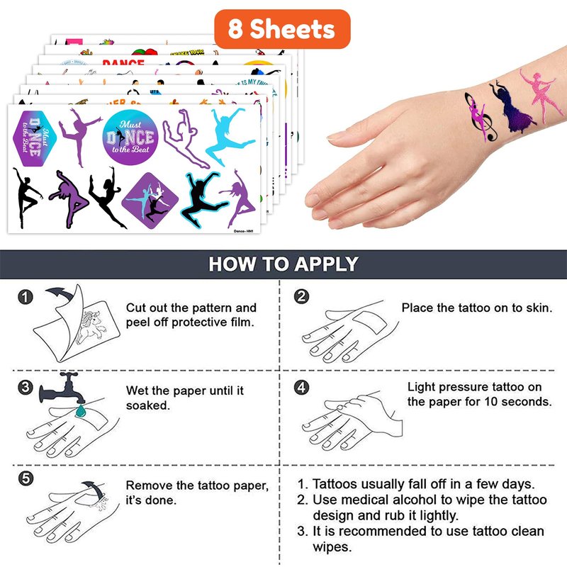 - Pattern rich: Dance Dancing Queen Cute Ballet Hip Hop Dancer Temporary Tattoos for Kids include 8 Sheets 96 PCS, the size of each sheet is 6.1 * 3.1 inches. Having a variety of characteristics, shapes and vibrant colors can stimulate your children's imaginations and bring a creative atmosphere to your Dancing Party.