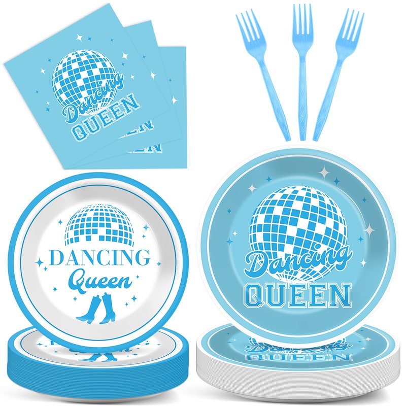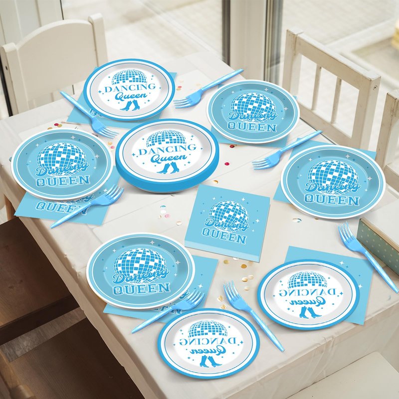- Package includes: You'll get 24 pieces of 9in dancing queen party paper dinner plates, 24 pieces of 7in dancing queen party dessert plates, 24 pieces of dancing queen napkins of 6.5in, and 24 pieces of plastic blue forks for each set that can serve 24 guests, creating a visually stunning table decor for your party.
