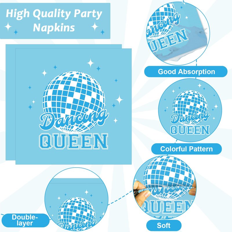 - Eye-catching design: Our dancing queen party plate and napkin party supplies feature stunning blue disco balls design, complemented by playful dancing shoes and the iconic text “Dancing Queen,” capturing the essence of the disco era, ideal for birthday parties and any celebration that needs a touch of retro flair.