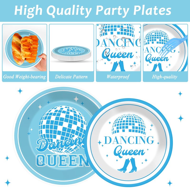 - Wide application: Whether you're hosting a 17th birthday party, Disco-themed parties, 70s 70s-themed events, birthday Celebrations, dance studio events, Dance-themed celebrations charity events, or social mixers that have a fun, upbeat theme. These dancing queen party dinnerware decorations can pair well with dancing queen tablecloth, dancing queen banners, and blue balloons to give your guests unforgettable memories.