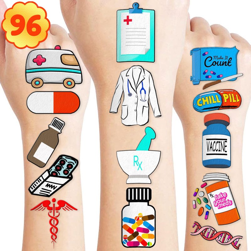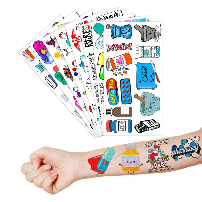 - Pattern rich: Funny Future Pharmacist Pharmacy Doctor Nurse Temporary Tattoos for Kids include 8 Sheets 96 PCS, the size of each sheet is 6.1 * 3.1 inches. Having a variety of characteristics, shapes and vibrant colors can stimulate your children's imaginations and bring a creative atmosphere to your Future Pharmacist Party.
