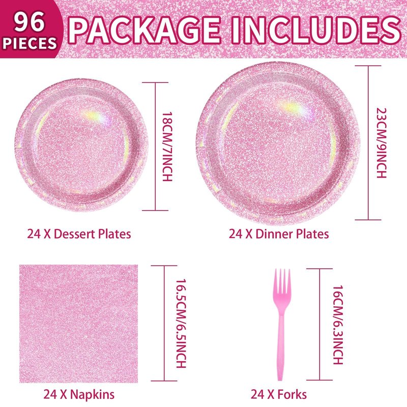 - 【Iridescent Party Supplies】Our pink and white party disposable tableware set include 24pcs pink dinner plates (9inch),24pcs pink dessert plates (7inch),24pcs pink napkins(6.5inch), 24pcs forks,making a total of 96 pieces.Make your party unforgettable with pink rainbow themed party decorations
