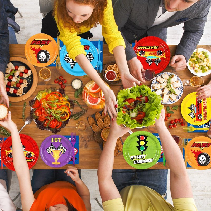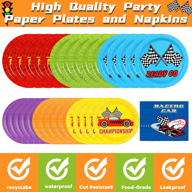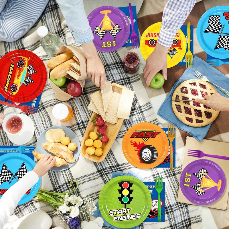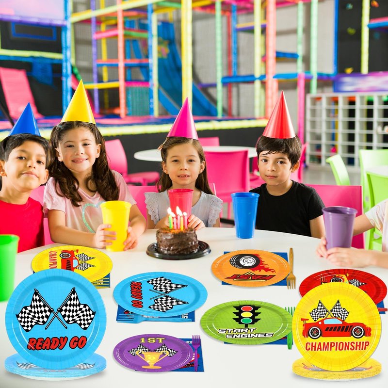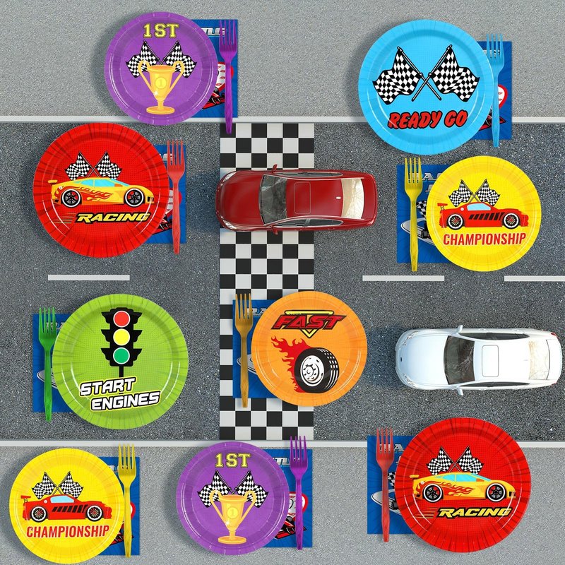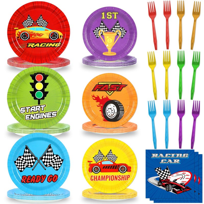 - Package Includes: 24 pcs 9-inch racing birthday party plates, 24 pcs 7-inch racing birthday dessert plates, 24 pcs racing birthday party napkins with forks in 6 different colors, classic elements with bright colors will create a speed car themed atmosphere for your birthday party.