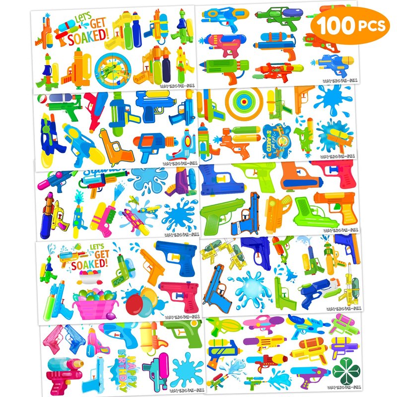 96PCS Water Squirt Gun Temporary Tattoo Stickers Pool Birthday Party Favors Decorations Supplies Decor Theme for Boys Girls School Classroom Activity Outdoor Prizes Rewards