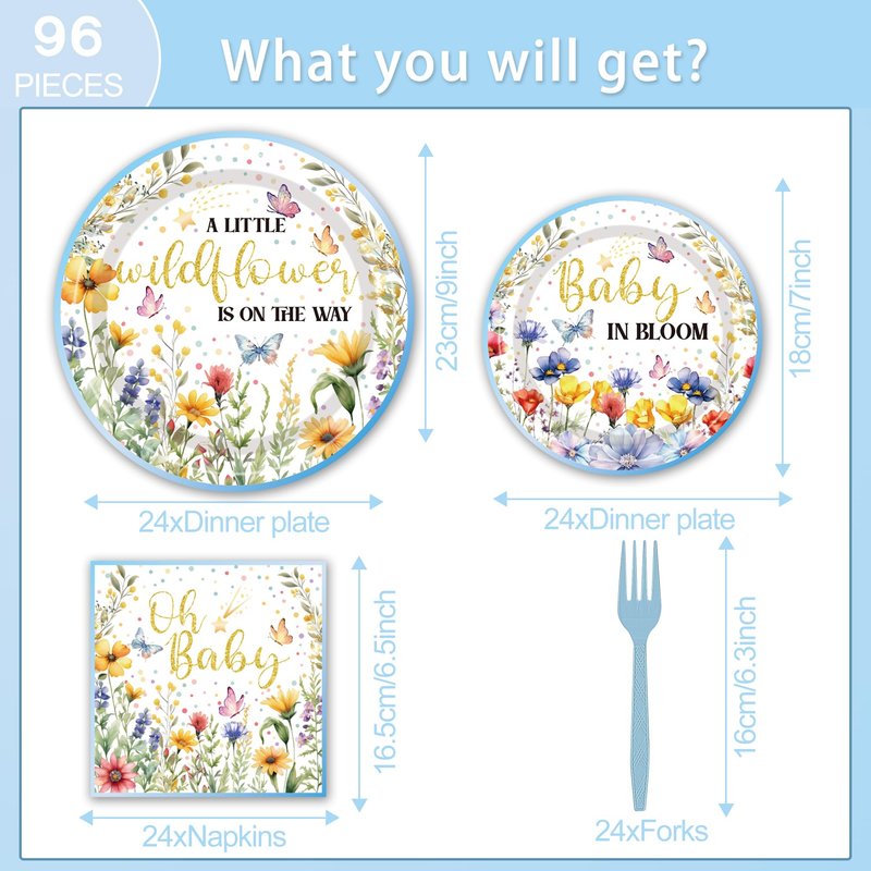 - Packing Include: Wildflower party decorations set includes everything you need : 24 dinner plates (9 inches), 24 dessert plates (7 inches), 24 napkins, and 24 forks, totaling 96 pcs, perfect for baby shower decorations for girl