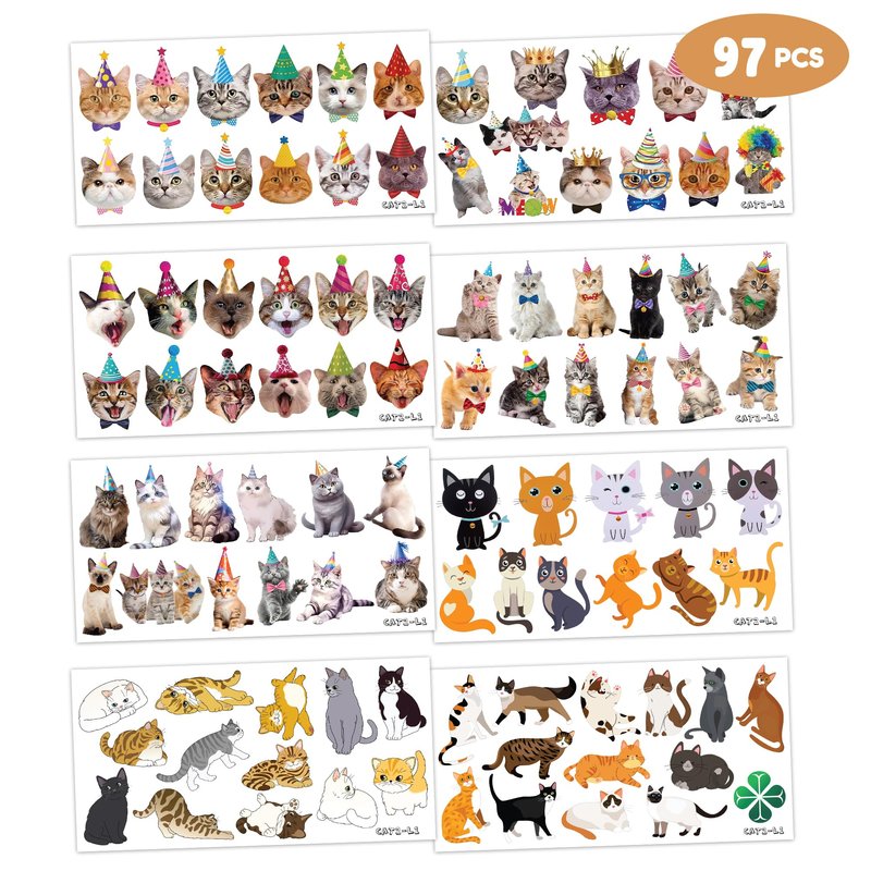 97 Pcs Funny Cat Temporary Tattoos Sticker Pet Animal Cats Themed Birthday Party Supplies Decorations Decor Favors Game Gifts Ideas Girls Boys Baby Showers Cute Fake Tattoo School Reward Home