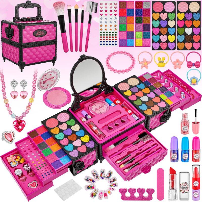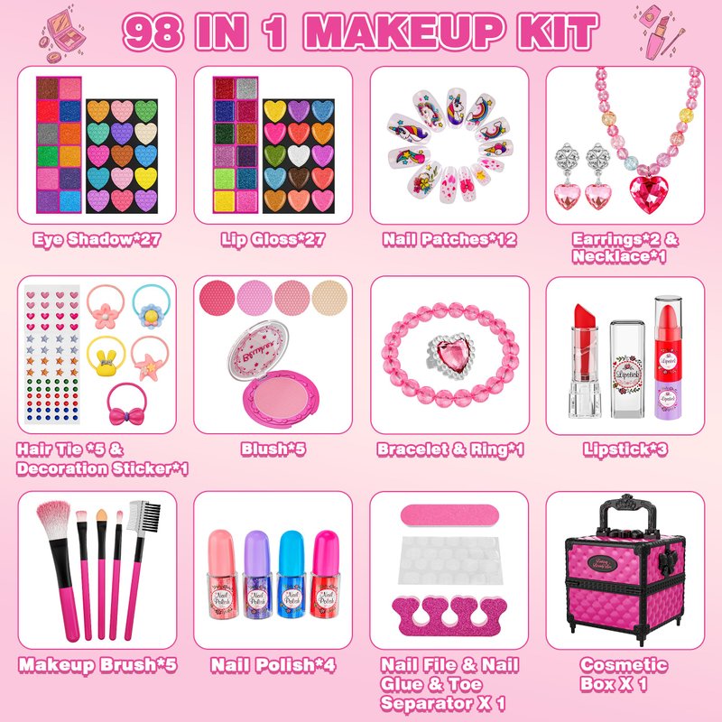 98 Pcs Kids Makeup Kit for Girls, Princess Toys Real Washable Cosmetics Set with Mirror, Hair Ties, Nails, Rings, Earrings, Necklace, Perfect for 3 4 5 6 7 8 Year Old Girls Birthday