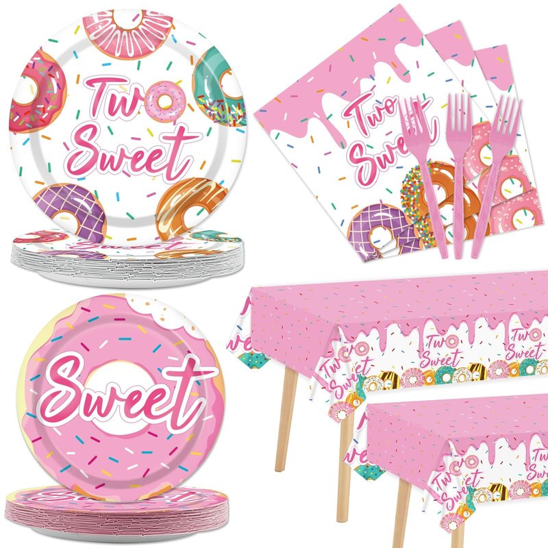- Package included: You will receive 2 pack two sweet donut plastic tablecloths, 24 pcs 9" two sweet donut paper dinner plates, 24 pcs 7" two sweet donut paper dessert plates, 24 pcs 6.5" two sweet donut napkins and 24 pcs plastic pink forks, each set can serve 24 guests.