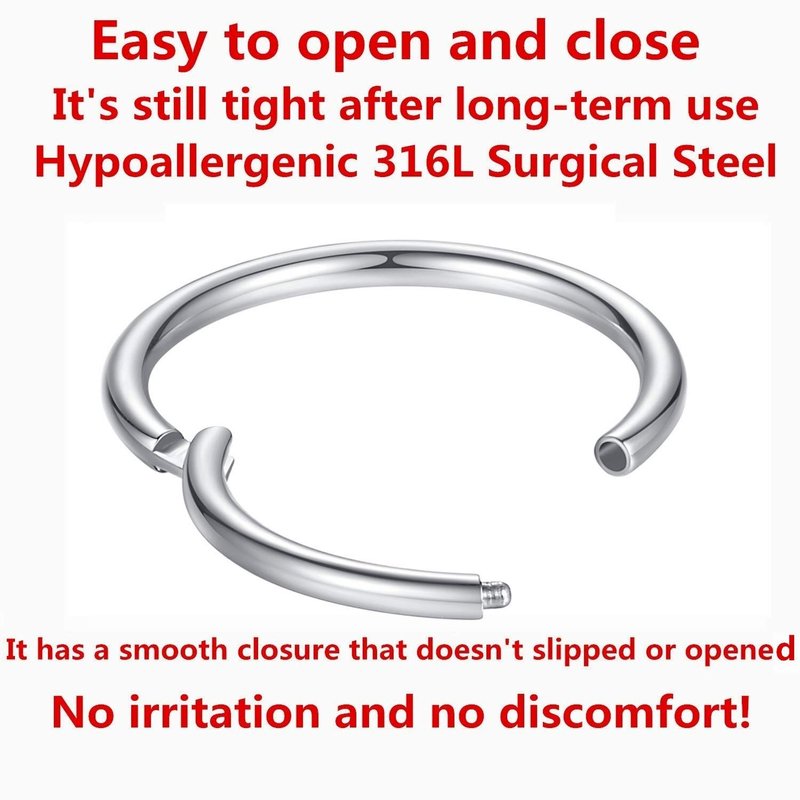- Perfect for Nose, Cartilage, Septum, Tragus Piercings,Helix Earring, Daith,Conch,Rook Ear Piercing, Lip Rings, Belly Ring,Nipple Piercing and more. Very easy to open/close a click closure by hand. Not require a tool.Smooth surface, comfortable to wear without sharp edge. Match with suitable apparel for different occasion. Smooth Surface and easy to use.