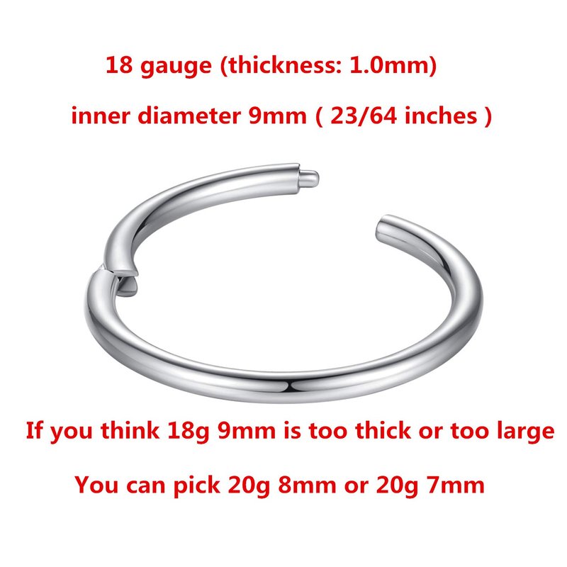 - Sold individually Nose Hoop Ring/Earring Hoop Size: 18 gauge (thickness: 1.0mm), inner diameter 23/64 inches(9mm ),Please choose your gauge and diameter hoop for your nose piercing needs.It has a smooth closure that doesn't slipped or opened. It's still tight after long-term use.