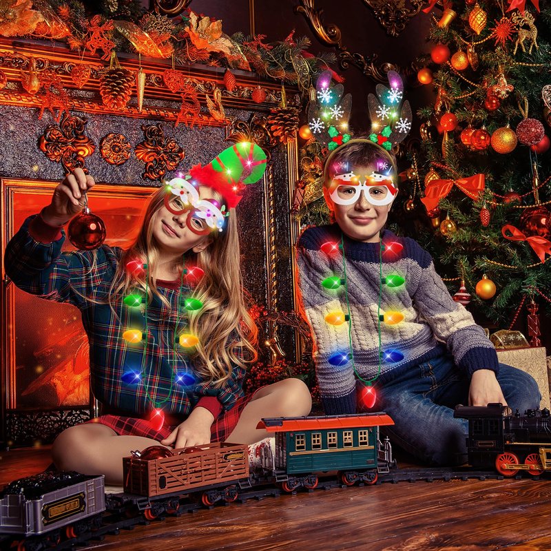 - Charming and Festive Design: Dive into the holiday spirit with Blowata LED Christmas headband, necklace, and glasses set. Featuring classic motifs like reindeer, trees, and elf hats on headbands, unique 3D bulbs on necklaces, and Santa, tree, and snowman designs on glasses.