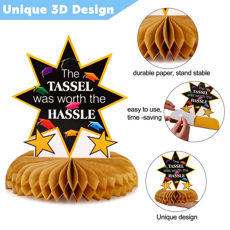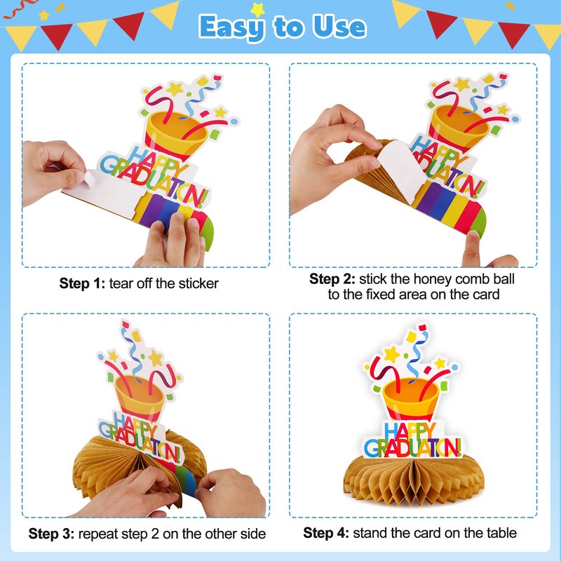 - Easy to Use: Simply tear off the sticker of the honeycomb ball, stick it to the card, and put it on the table. Save time and hassle with these easy-to-use graduation party supplies.