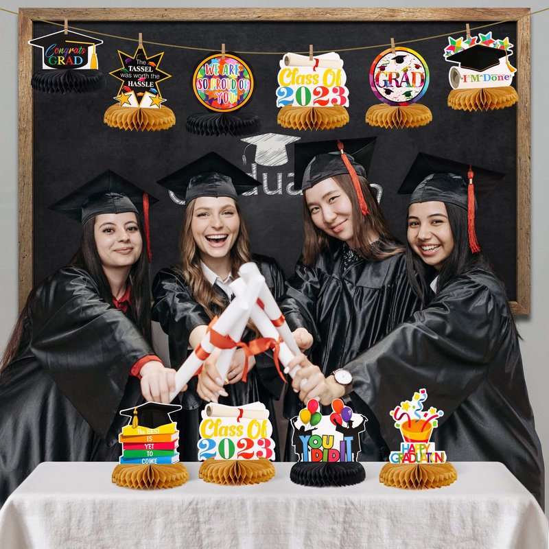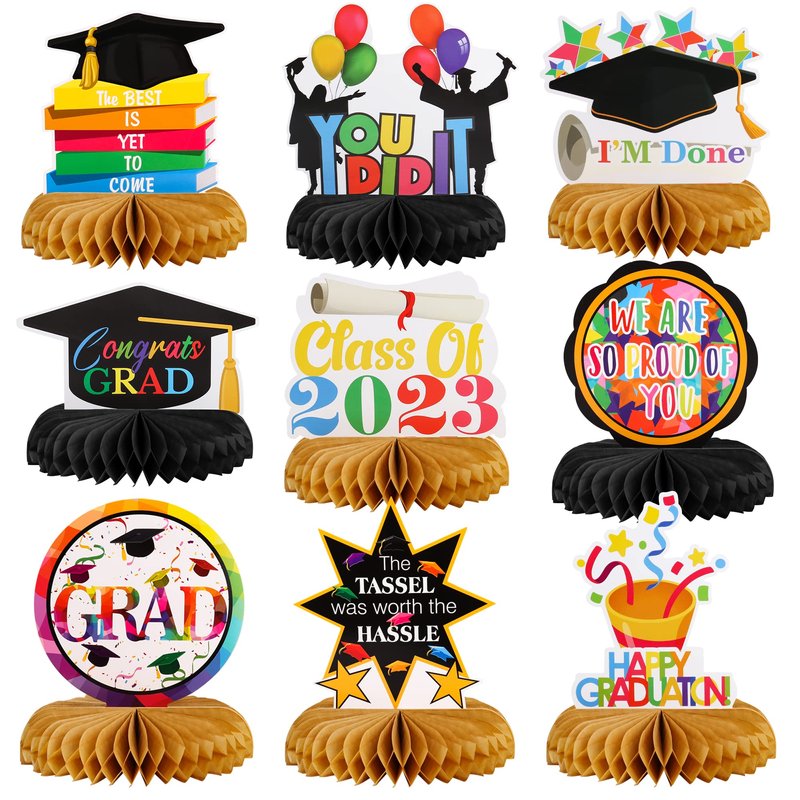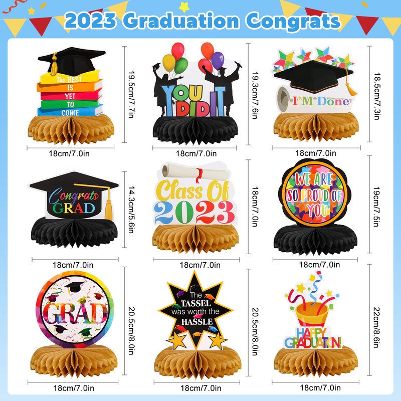 - Celebrate in Style: 9Pcs honeycomb centerpieces featuring stars, insignias, mortarboards, diplomas, and more to add a chic and fun touch to your graduation party theme.