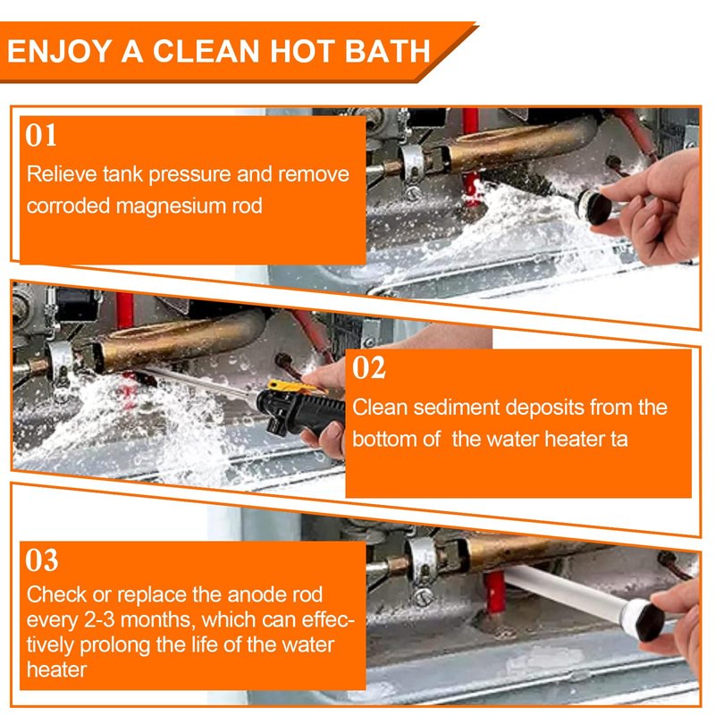 - 🚐【 You Will Be Given An Rv Water Heater Cleaning Kit】contain 2x anode rods, 1x RV water heater flush wand, 1x stainless steel bristle, 2x Teflon tape and 2x drain plugs,1xDual Hex Wrench Removal Tool. To prevent you from injury, and splashing of sewage, please be sure to turn off the water heater, cool the hot water, and release the pressure in the tank!