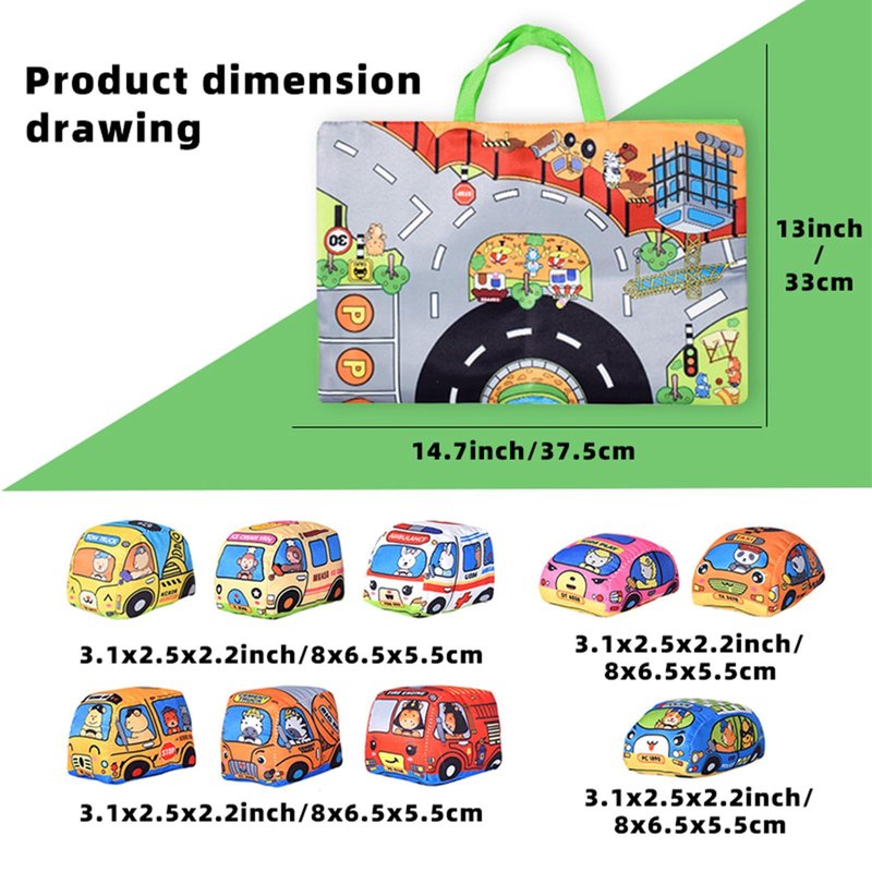 - Baby Soft Car Toys: The set contains nine plush fabric cars and a multi-functional play mat that can be folded into a storage bag. This two-in-one design supports a variety of play methods and is convenient for storage, cultivating baby's organizational skills, suitable for children aged 1 2 3 years old.