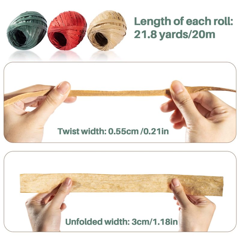 - Product includes: 9 rolls of raffia paper rope. There are three colors of paper rope in total, 3 rolls for each color, and the length of one roll is 21 yards/20 meters to meet your usage needs. If you encounter any problems, please contact us immediately, we will provide you with satisfactory service.