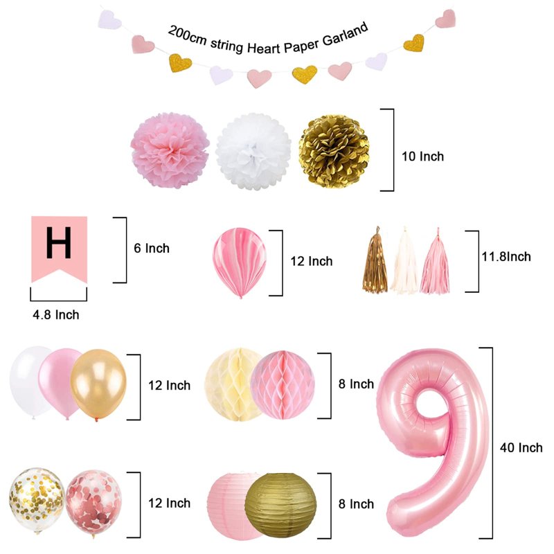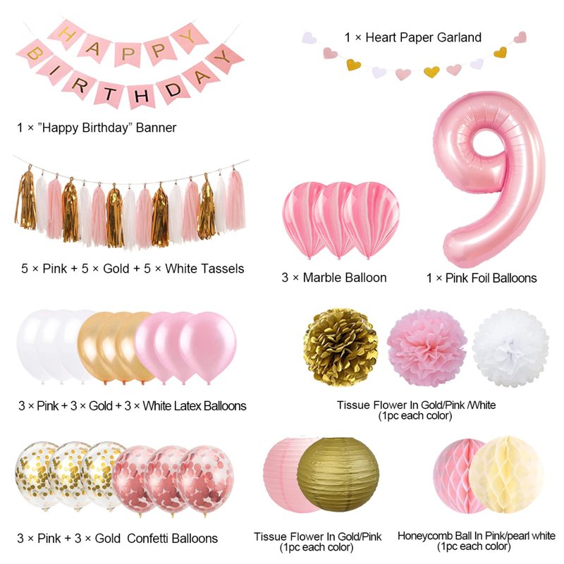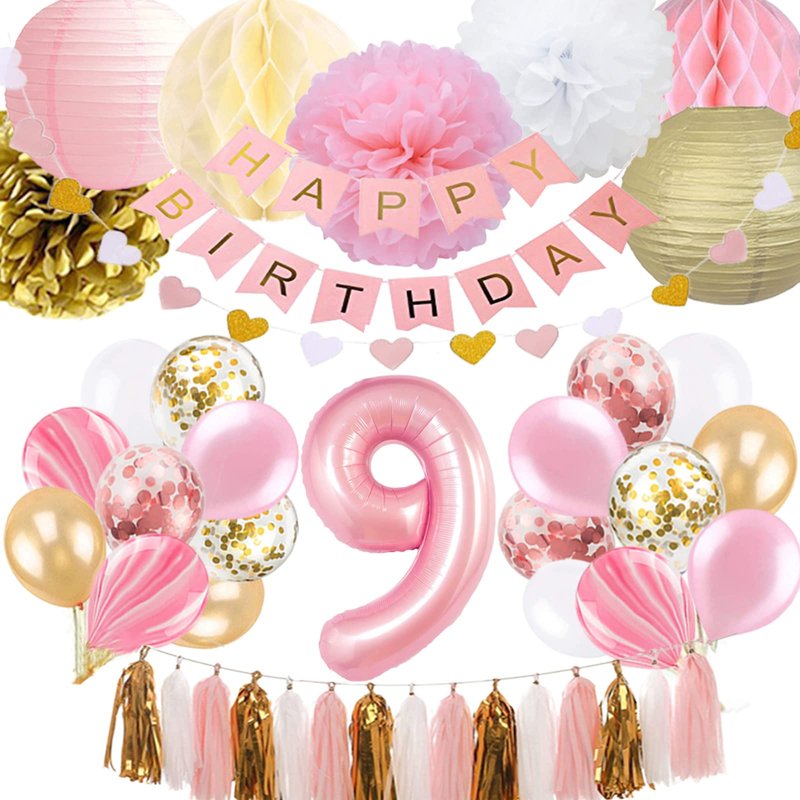 - ALL-IN-ONE Super Value 9th Birthday Girl Decoration: The package includes 1 happy birthday banner, 1 glitter paper garland, paper lantern( 1 gold, 1 pink), pom poms(1 gold, 1 pink, 1 white), honeycomb ball(1 beige, 1 pink), number 9 balloon, 12 latex balloon, 6 confetti balloons, 15 foil tassel(5 pink, 5 gold, 5 white)