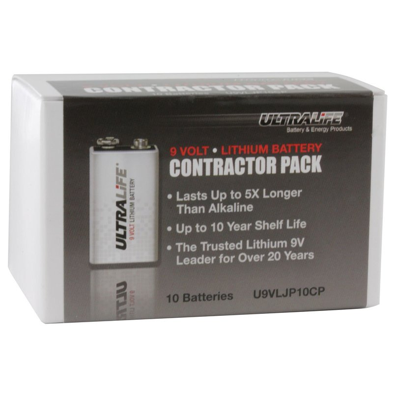 Ultralife introduced the world's first long lasting Lithium 9-Volt over 20 years ago, with over 100 million sold. Ultralife's Lithium 9-volt battery is a consumer-replaceable battery that lasts up to 5 times longer than ordinary alkaline 9V batteries and 10 times longer than carbon-zinc batteries. It has the highest energy density, flattest discharge voltage curve, longest shelf life, widest operating temperature range, and lightest weight of any comparable 9-volt battery. A 10-year service / shelf life makes our 9-volt battery the choice for major smoke alarm manufacturers for their premium lines of 10-year ionization-type smoke alarms. As a consumer-replaceable battery, consumers can instantly upgrade any application requiring a 9-volt battery.