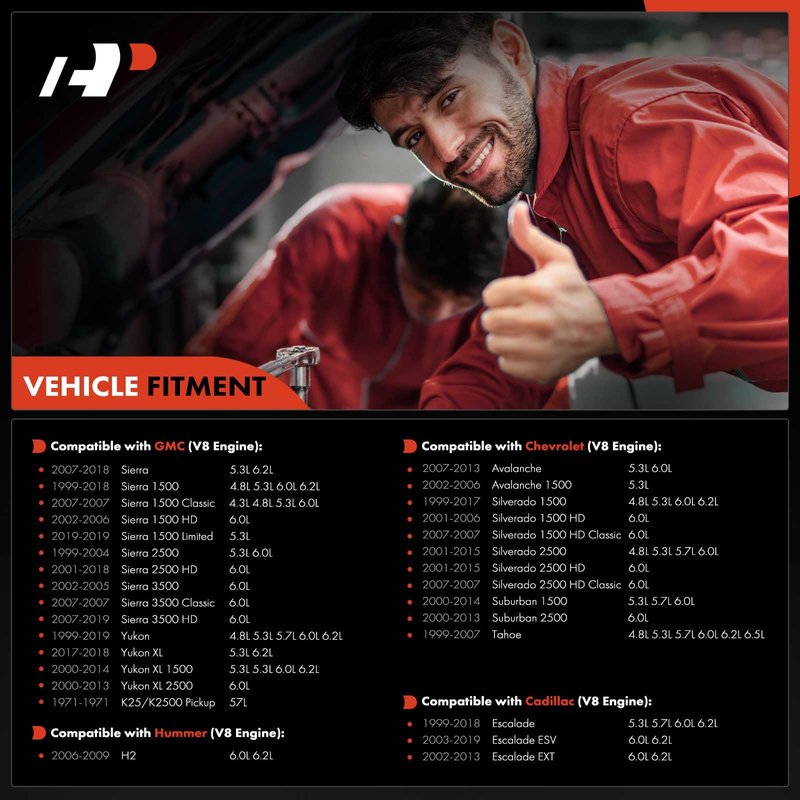 - [Vehicle Fitment-2]: Compatible with GMC Sierra 2007-2018 // Sierra 1500 1999-2018 // Sierra 1500 Classic 2007-2007 // Sierra 1500 HD 2002-2006 // Sierra 1500 Limited 2019-2019 // Sierra 2500 1999-2004 // Sierra 2500 HD 2001-2018 // Sierra 3500 2002-2005 // Sierra 3500 Classic 2007-2007 // Sierra 3500 HD 2007-2019 // Yukon 1999-2019 // Yukon XL 2017-2018 // Yukon XL 1500 2000-2014 // Yukon XL 2500 2000-2013 // K25/K2500 Pickup 1971-1971 ---- V8 Engine