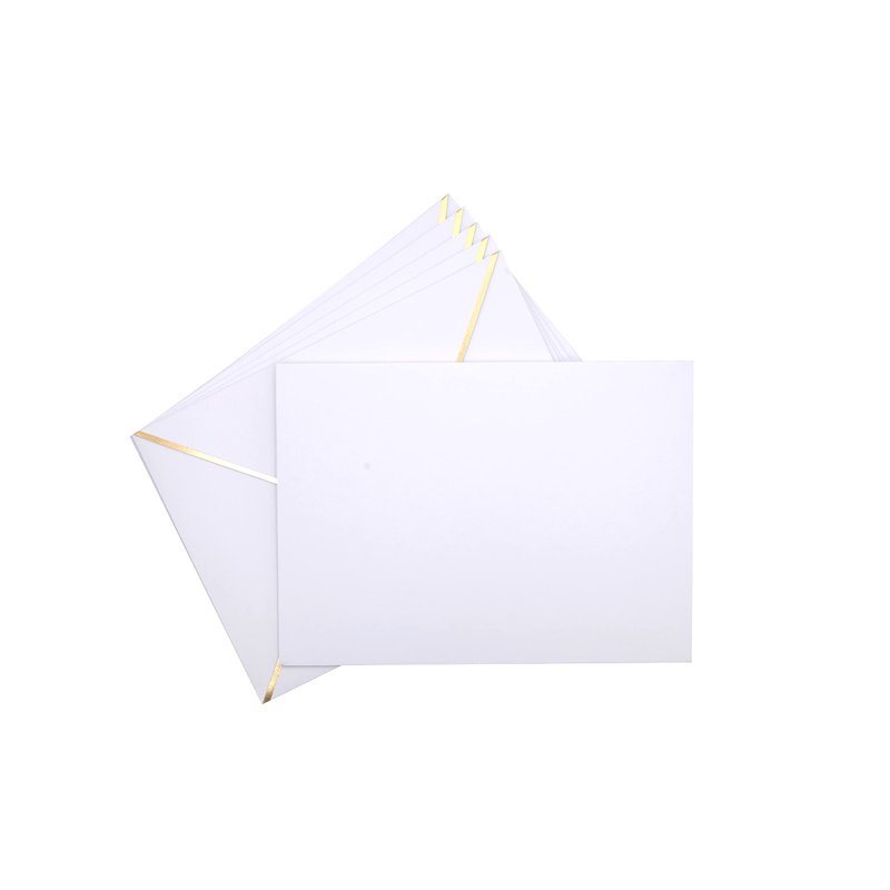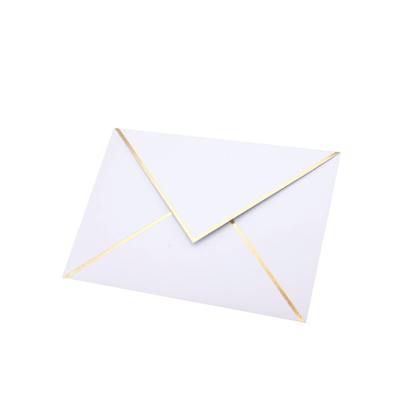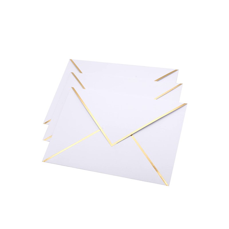 25 PACK: Each pack includes 25 White A7 size envelopes. LUXURY DESIGN: V flap envelope design with gold foil borders on the front of the envelope for an elegant, classy and fancy look. QUICK SEAL: Peel and seal quickly and securely with the pre-applied double-sided tape - Wrinkle-free closure. MAILING ENVELOPE: Made out of 180 gsm thick quality paper- great for mailing without bending. A7 SIZE: All envelopes measure 5.25"x 7.25"- standard A7 size for 5" x 7" greeting cards and photos- perfect for invitation, wedding, party, baby shower, bridal shower and more!