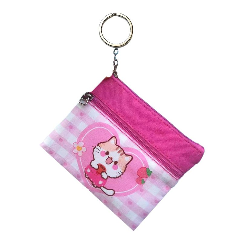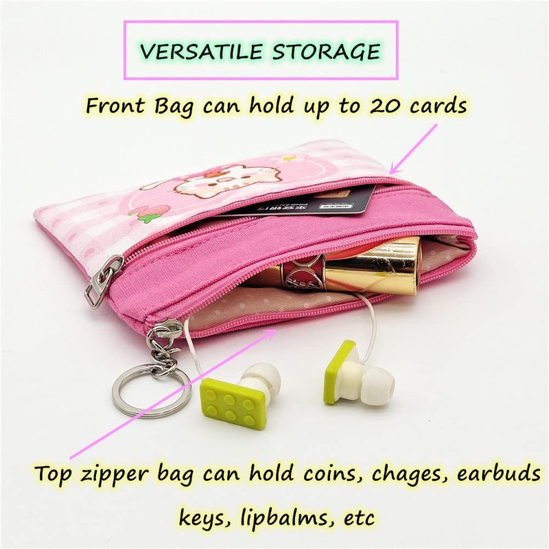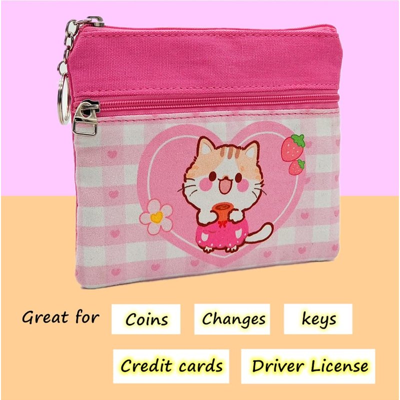 - This adorable coin bag is designed to bring a smile to your face every time you reach for your spare change. With its charming kitty design and vibrant colors, it's an instant mood lifter. The double zipper design provides you versatile storage, while the sturdy keyring attachment ensures that you can keep it securely with your keys or attach it to your bag or belt loop for quick and convenient access.