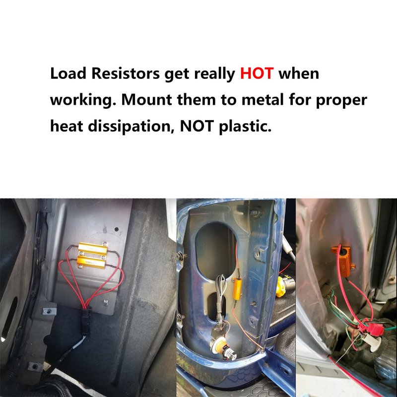 - Warning: Load Resistors heat up like halogen bulbs. They get really HOT when working. Mount them on metal surface by screws(not included). Keep resistors inchs away from plastic parts.
