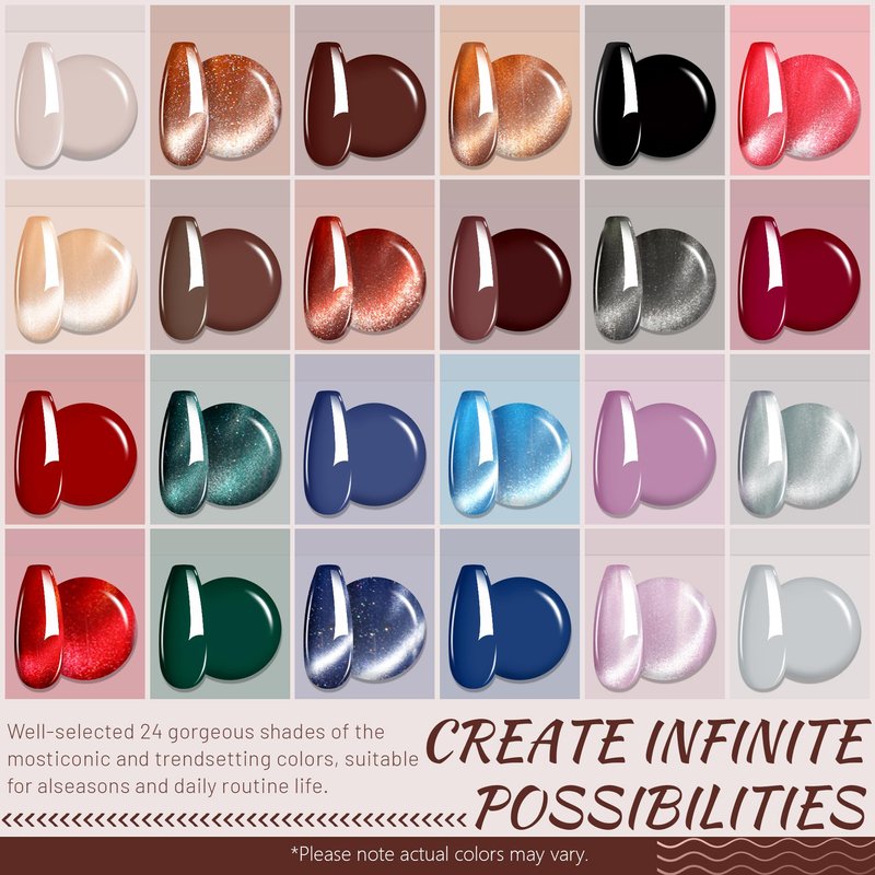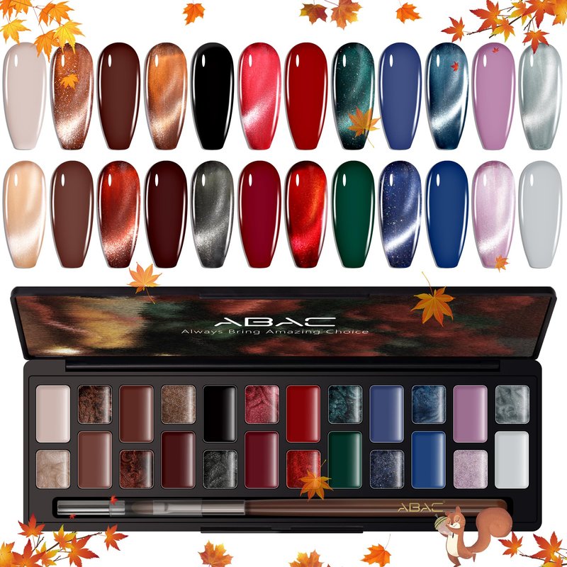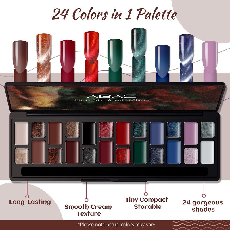 - New Popular Gel Nail Polish Set:ABAC cat eye solid gel polish with 24 well-selected daily routine colors. Can be worn alone, or as color base and practically work with kinds of Manicure Styles. With 1* nail brush and magnet, Upgraded the gel form of the regular liquid to solid, the weight of heavy to light, bottles & jars to 1 palette - 24 colors in 1