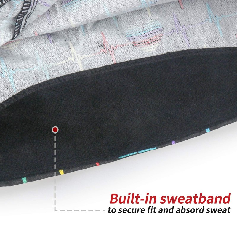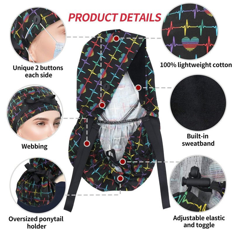 - Unmatched quality: our scrub caps are designed with your comfort in mind. Featuring an added sweatband and two buttons on the sides to secure your mask, plus an adjustable elastic on the back for a perfect fit.