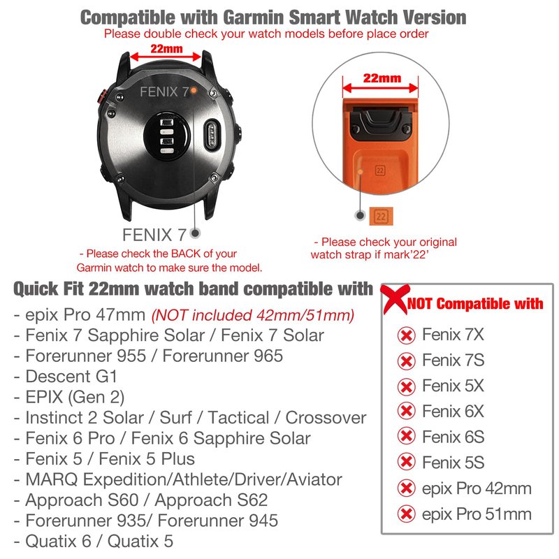 - 【Compatible Models】Quickfit 22mm watch band Compatible with Garmin Fenix 7 Solar / Sapphire Solar, EPIX(Gen 2) , Forerunner 955/965, Instinct 2,Descent G1, Fenix 6 Pro/Sapphire,Fenix 5/5 Plus,Approach S60/S62,Quatix 5/Quatix 6,Instinct/Instinct Tactical,Forerunner 935/945,MARQ. NOT fit for Fenix 6X Pro/Sapphire,NOT fit for Fenix 5X/5X Plus,NOT for Fenix 5S/5S Plus,Fenix 6S Pro/Sapphire. ONLY Watch Band, NOT inclued smart watch.