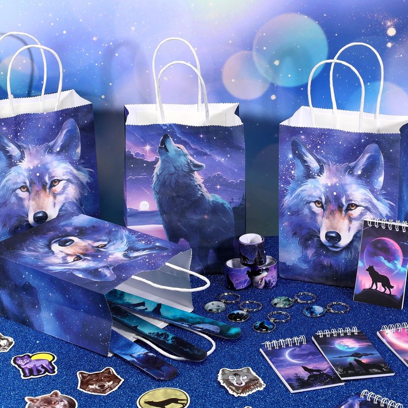 - Wolf Birthday Party Supplies: package includes 12 wolf paper bags with handles, 12 spiral wolf mini notebooks, 12 wolf keychains, 12 wolf slap bracelets and 50 wolf stickers; Enough quantity and delicate combination to meet your parties gifting demands