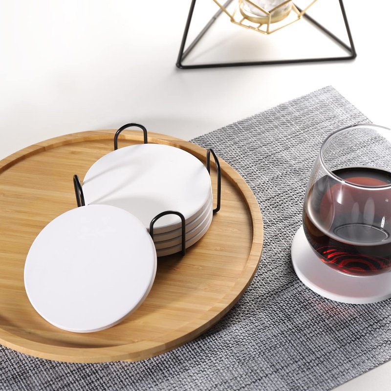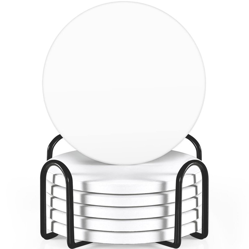 - Drink Coasters: Package includes 6pcs white round ceramic coasters, 4 inch diameter, simple pure white design and a durable metal coaster holder for easily storage, keep your home tidier
