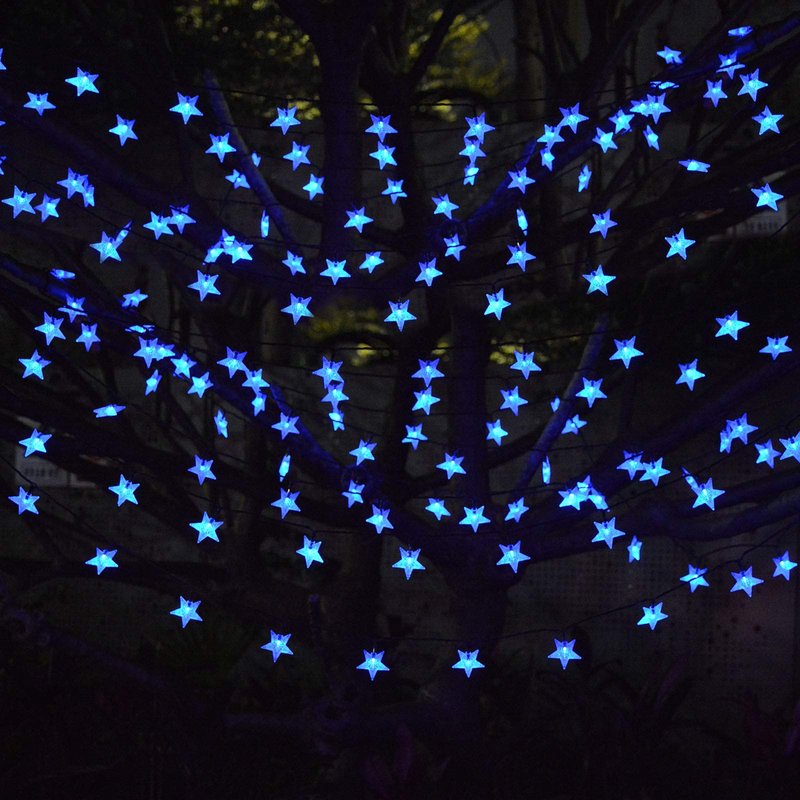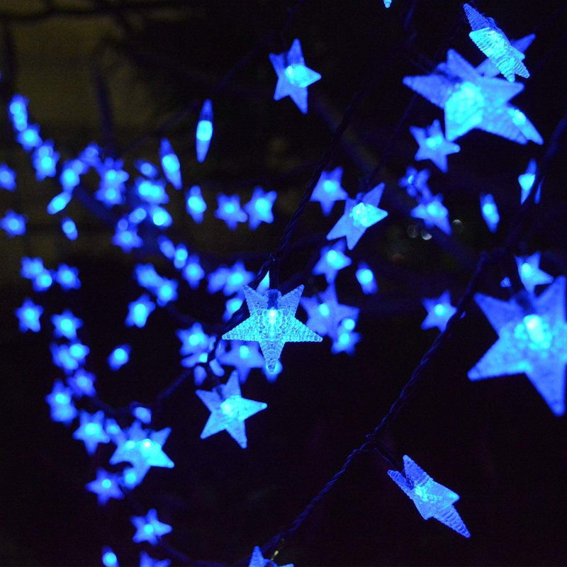 - Lots of Blue Star Fairy Lights: 120 LED blue stars, 50ft lighted string wire, 6.5ft lead wire, 55ft total length, 4.9 inch distance between LED bulbs