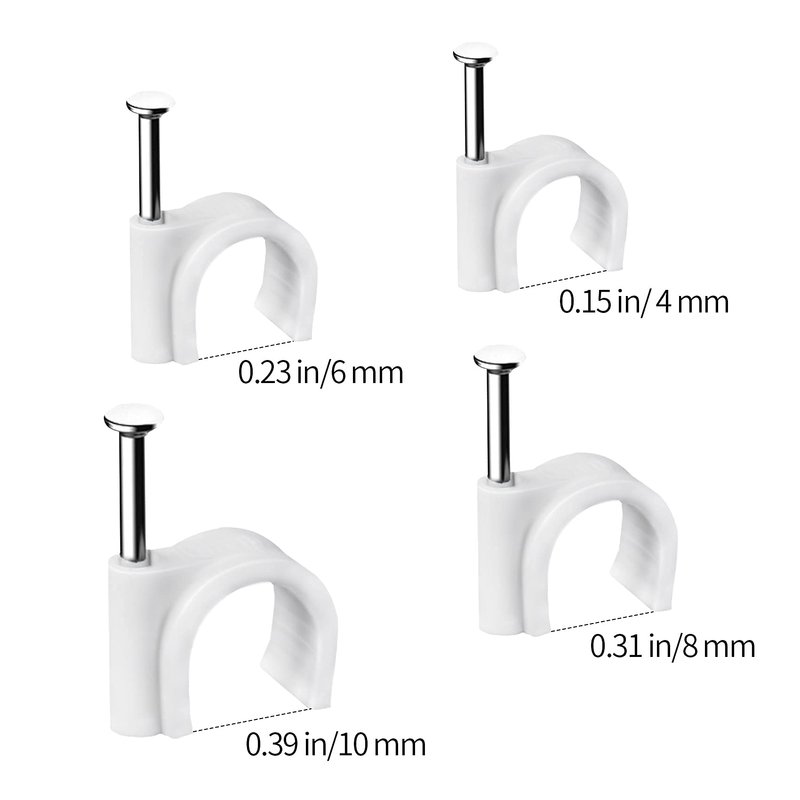 - [ Durable ] Cable clips are made of premium stabilized plastic, white style is more versatile, and integrates with the home environment to make it cleaner. Round cable clips allow you to secure runs of round cables like coax to walls and floorboards for a cleaner look and prevent tripping over loose cables