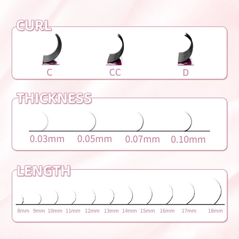 - 【Specifications】ABONNIE easy fan eyelash extensions is 12 rows in one tray. Curl: C/CC/D, Thickness: 0.03 0.05 0.07 0.10mm, Length: Mix 8-15mm, Single: 8mm 9mm 10mm 11mm 12mm 13mm 14mm 15mm 16mm 17mm 18mm.You can choose the best suitable length that make your work easily.