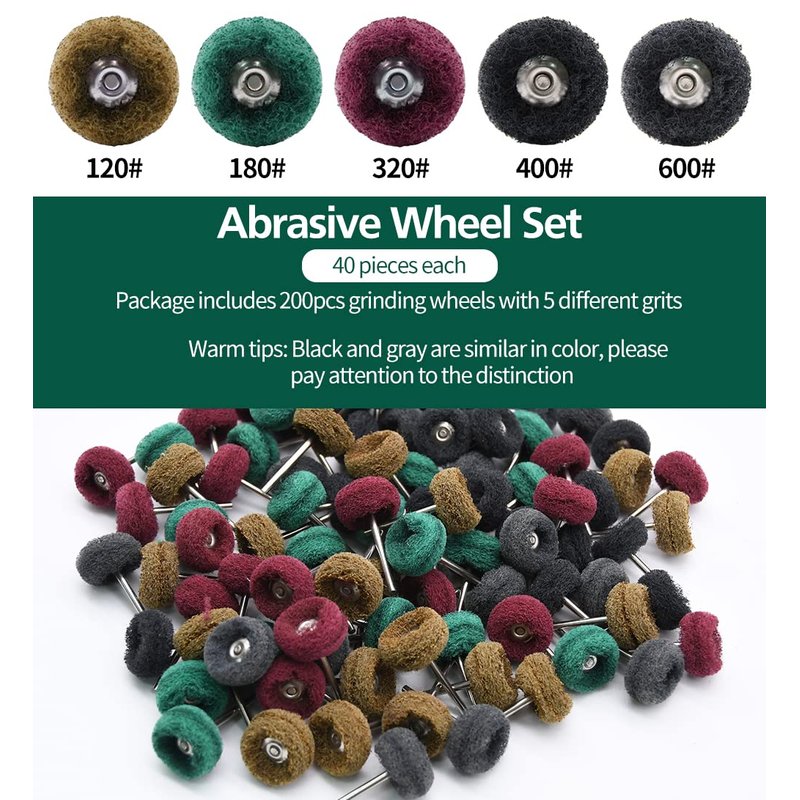 - 【Abrasive Wheel Set】- The package includes 200pcs 1in/25mm grinding wheels with 1/8in/3mm silver handle and 5 different grits, brown 120grit, green 180grit, red 320grit, black 400grit, gray 600grit, 40 pieces each.
