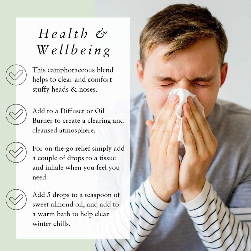 - AROMATHERAPY - A blend of 7 perfectly balanced essential oils to help cleanse and soothe. Each of these oils contributes in various ways, for example, the Peppermint targets blocked sinuses and headaches whilst the Eucalyptus helps to clear the lungs and airways.