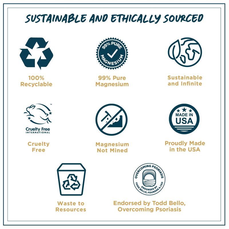 - SUSTAINABLE AND ETHICALLY SOURCED materials are at the core of who we are. All of our products have complete traceability from source ingredients to the final products you use everyday. Our magnesium is 99% pure and never mined, and we refuse to test on animals, which is why we’re so proud to be Leaping Bunny approved.