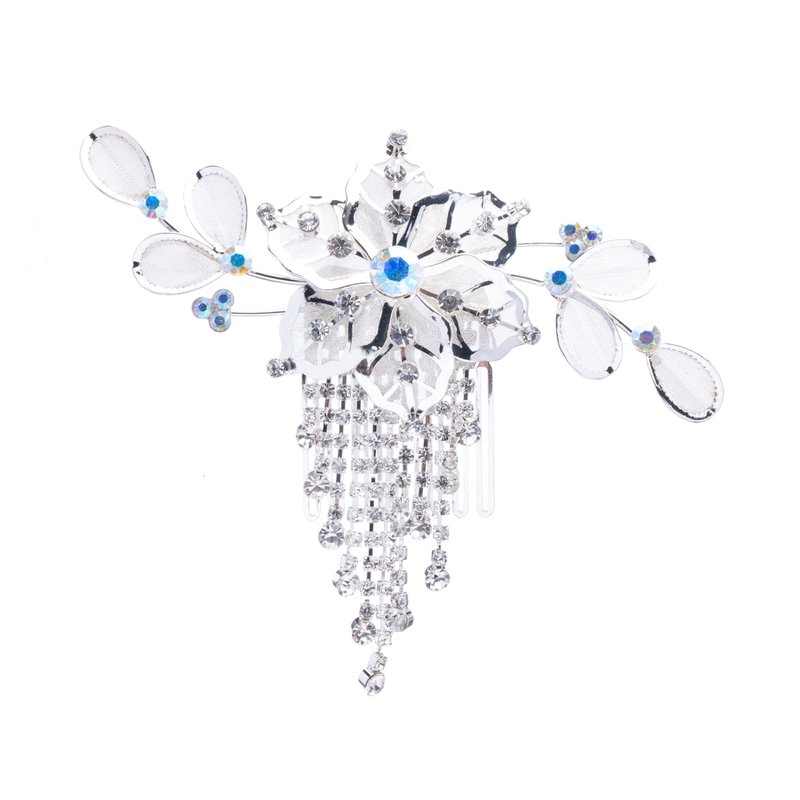 Beautiful and brilliant, this silver plated accent décor comb features an elegant bridal pattern with dazzling clear rhinestones. This is a perfect accessory for any bride! This is a beautiful hair comb that is just simply perfect for weddings, proms, or any special occasion. Dresses up an ordinary hair style with much more elegant dazzle!