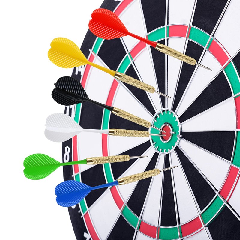 - Package Include: 18 pc steel tip darts. The flights come with 3 of each color: Red, Black, White, Yellow, Blue and Green.