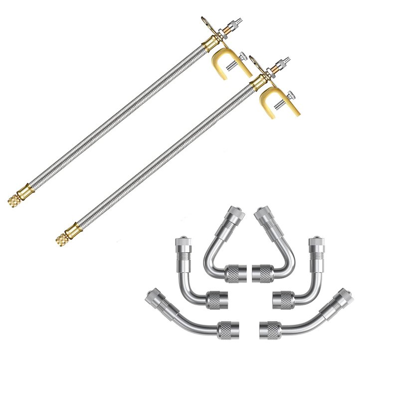 Package includes: there are a total of 2 pieces 12 Inch stainless steel valve stem extensions and 6 pieces brass valve stem extenders in the package Quality material: the nut of the braided valve stem extender is made of reliable copper, and the braided flexible hose is made of stainless steel, sturdy and solid, will not break or deform easily, can serve you for a long time; And the tire valve stem extension is made of brass, with metallic luster, can keep bright after long term use, the surface and edge are polished carefully, do not worry they will scratch your hands while using, not easy to wear and tear Convenient to install: first screw the metal valve stem extender on your tire valve, then connect the hose to the tire inlet through the valve stem extension to inflate the tire, you can choose different angles according to your actual needs, the right angle bend allows easy access for the pump, the operation is simple, and convenient to use Wide application: this valve stem tool can be widely applied on most cars, such as RVs, passenger cars, trucks, motorcycles, trailers, bicycles and recreational vehicles with standard American tire valves, provides convenience for your life, and making your inflating process more simple and smooth Fit type: Universal