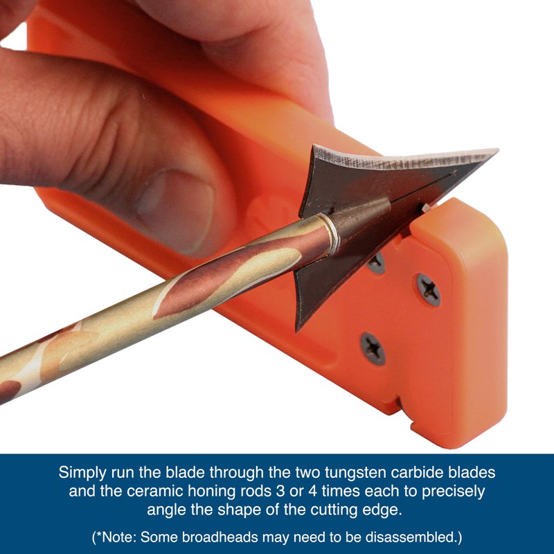 - VERSATILE & EASY TO USE: Our broadhead sharpener & Wrench is easy and safe to use. It is compatible with 2, 3, 4, and 5 blade broadheads. Simply run the blade through the two tungsten carbide blades and the ceramic honing rods 3 or 4 times each to precisely angle the shape of the cutting edge. Note: Some broadheads may need to be disassembled for optimal sharpening.