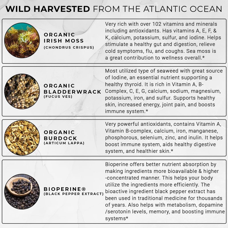- 4-In-1 ORGANIC SUPERFOOD BLEND - Sourced from clean, natural waters of the Atlantic Ocean. This 100% wildcrafted pure sea moss contains 102 essential vitamins, nutrients, and minerals that fortify your wellness from within. We produce our Sea Moss using the finest Organic ingredients (Sea Moss, Burdock Root, Bladderwack) to make sure you reap all the benefits. We also added BioPerine (Black Pepper Extract) to make sure you get maximum absorption in each capsule.