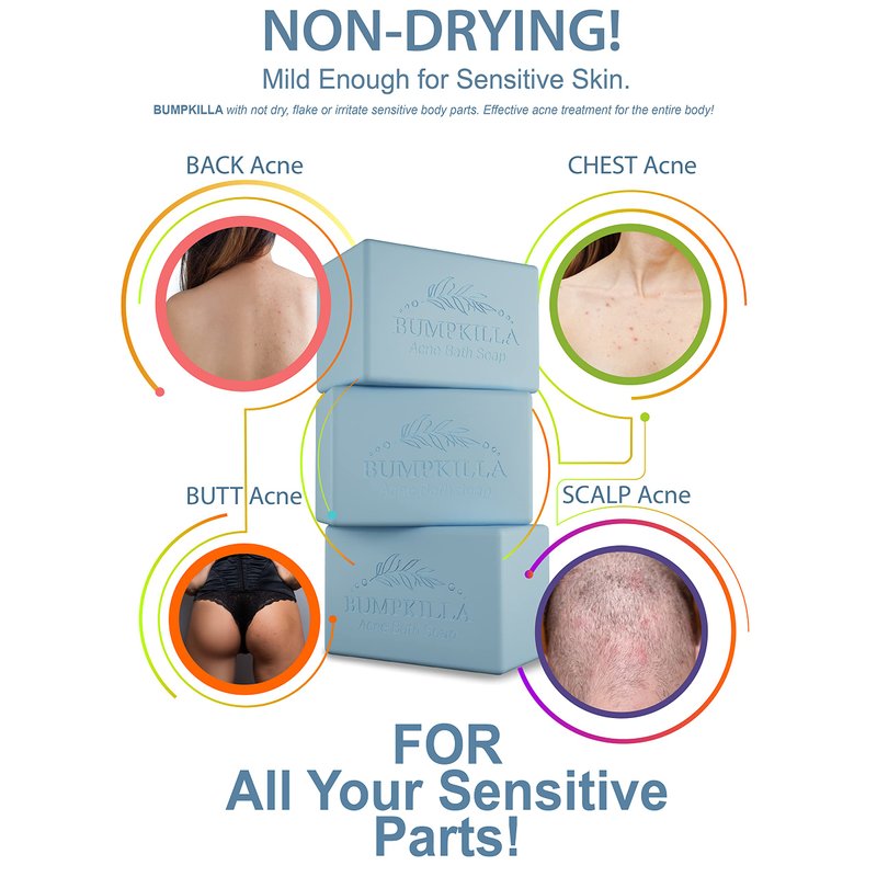 - No Dry Skin - Each BumpKilla acne bath bar is handcrafted and infused with acne medicine for all your sensitive body parts. It will not dry or clog your sensitive skin. Whether it's back acne (bacne), chest acne, butt acne or acne on your scalp, regular everyday use will help keep acne away. BumpKilla acne bar is a perfect replacement for your acne body wash and/or back acne spray. Simply lather using washcloth/bath-gloves [bare soap bathing lacks efficacy removing dead skin cells], then rinse.