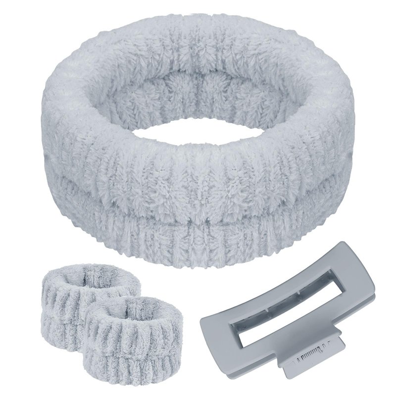ACO-UINT 4Pcs Gray Spa Headband and Face Washing Wristbands Set, Skincare Headband Face Wash Headband Makeup Headband, Hair Claw Clip Skin Care Headband for Washing Face