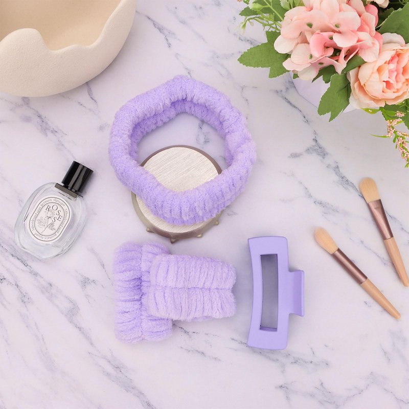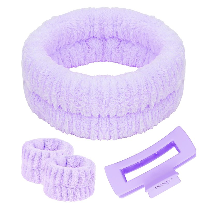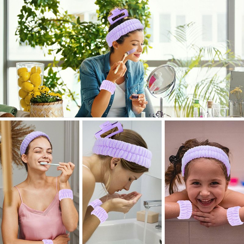 ACO-UINT 4Pcs Purple Spa Headband and Face Washing Wristbands Set, Skincare Headband Face Wash Headband Makeup Headband, Hair Claw Clip Skin Care Headband for Washing Face