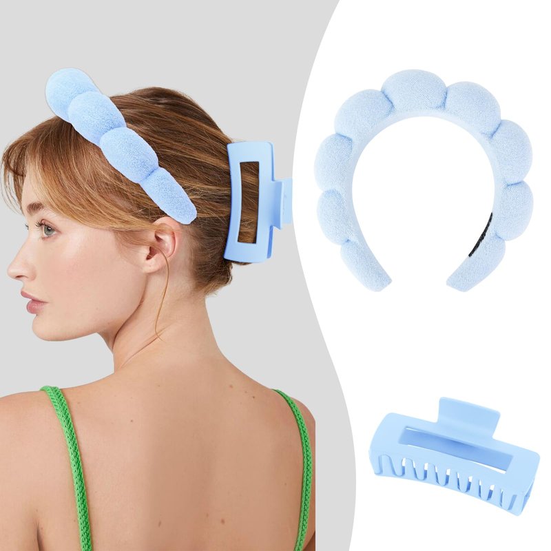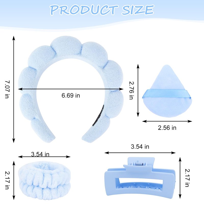 - Soft Material: The hair band for washing face is made of premium terry cloth fabric and sponge with adorable clouds shape design. The 2pcs face washing wristbands are made of soft microfiber, 2pcs powder puffys are made of premium cotton and soft velour, 1pcs large claw clip is made of durable PC material.